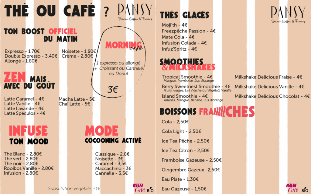 Chez Pansy, le brunch est bien plus qu’un repas : c’est un rituel joyeux, un moment suspendu entre douceur et créativité. Situé à Avignon Le Pontet, au sein du Décathlon, notre fast-food de brunch casse les codes et cultive l’authenticité.
